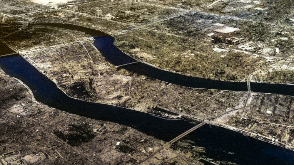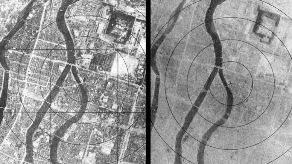 Le dôme de Genbaku, seul bâtiment à être resté debout près du point zéro de l’explosion (à droite, le pont en T était la cible du bombardier)
