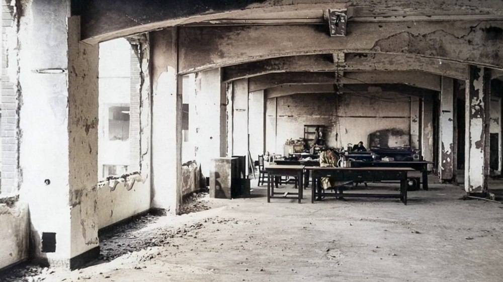 Ombre humaine sur les marches de la banque Sumitomo à Hiroshima en décembre 1946 et reconstitution