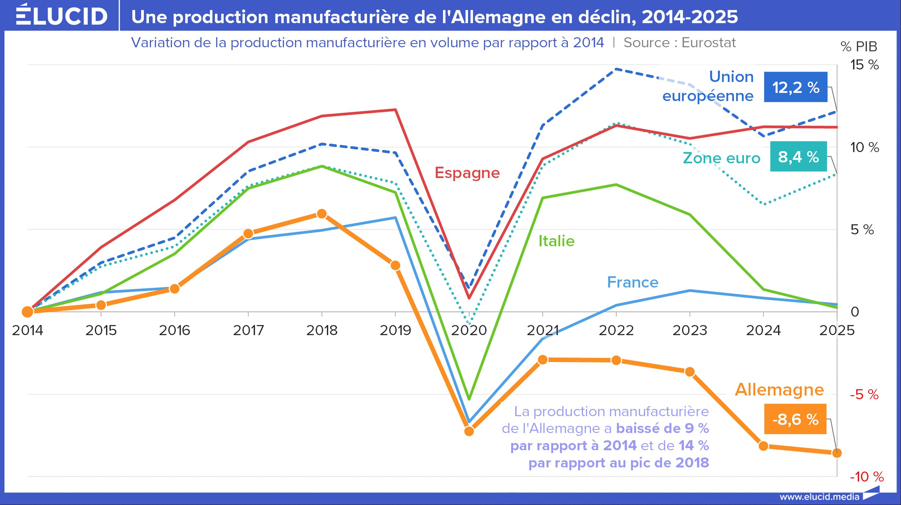 La production industrielle de l’Allemagne, première économie de l'Union européenne, est en déclin depuis plus de cinq ans. Depuis deux ans, notre voisin d’outre-Rhin est en récession, le produit intérieur brut (PIB) réel s’est contracté de 0,2 % en 2024, après une baisse de 0,3 % en 2023.