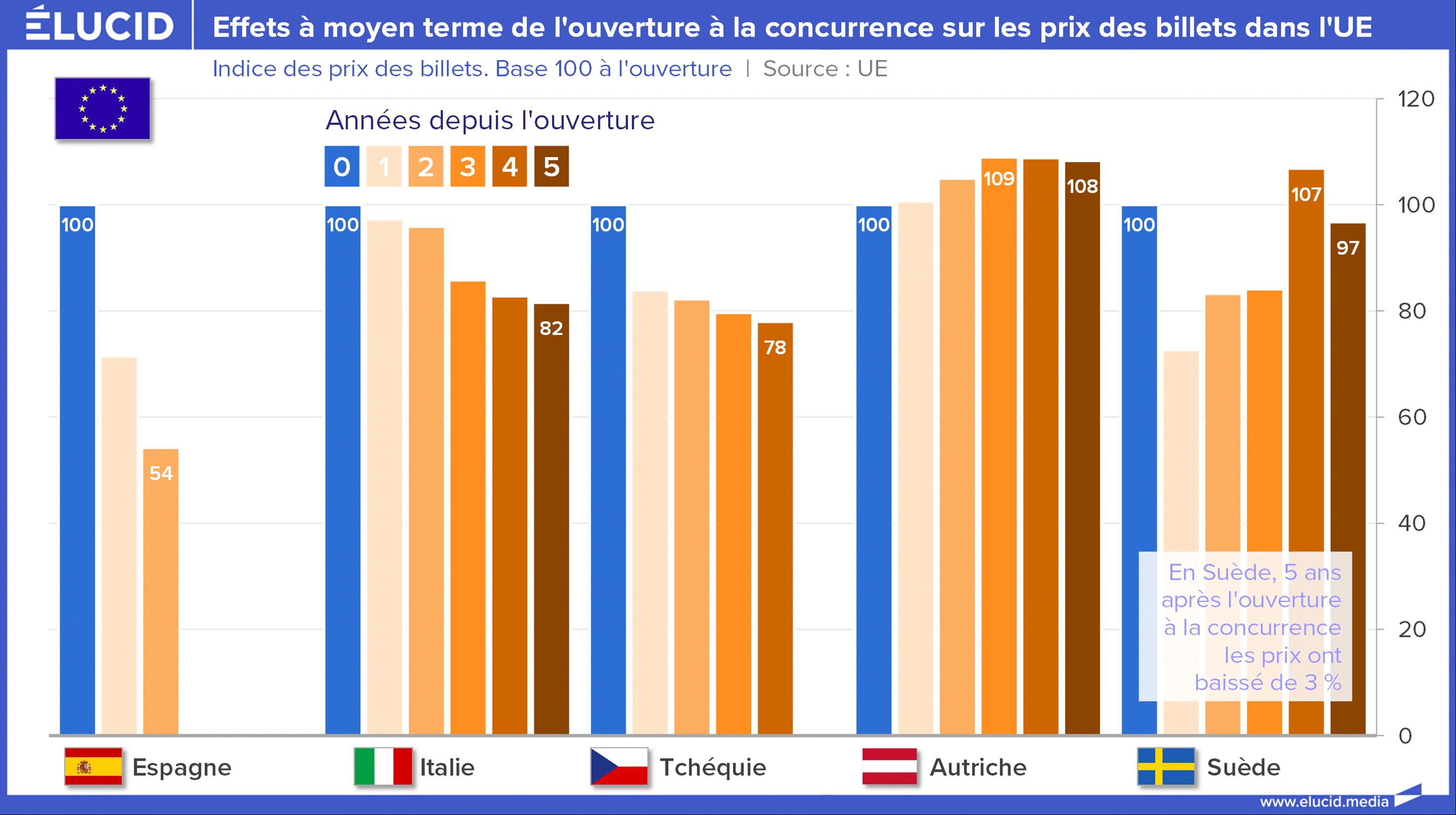 Suite à la directive européenne de 1991, l'Allemagne et le Royaume-Uni ont été pionniers dans l’ouverture du train à la concurrence, suivis par d'autres pays comme l'Italie et l'Autriche. Les opérateurs historiques y ont perdu 20 à 40 % de parts de marché sur les lignes principales, selon le cabinet de conseil McKinsey. Le cabinet pointe une amélioration du niveau de service, une réduction des temps de trajet, une augmentation de la fréquence des trains et une baisse des prix : « La pression sur les prix (par exemple, une réduction de rendement d'environ 20 à 25 % sur les lignes concurrentes) a été plus que compensée par la demande accrue ». Le syndicat des travailleurs du transport européen donne un son de cloche un peu différent de celui de McKinsey :