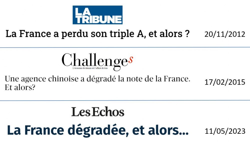 Le 2 juin, l’agence de notation Standard and Poor’s (S&P) n’a finalement pas dégradé la note de la dette publique française, probablement pour se différencier de sa concurrente Fitch, qui a dégradé la France le 1er mai 2023. Mais comme S&P a assorti le maintien de sa note à une « perspective négative », cela signifie qu’une dégradation adviendra probablement d'ici quelques mois. Rendez-vous à la fin de l'année.