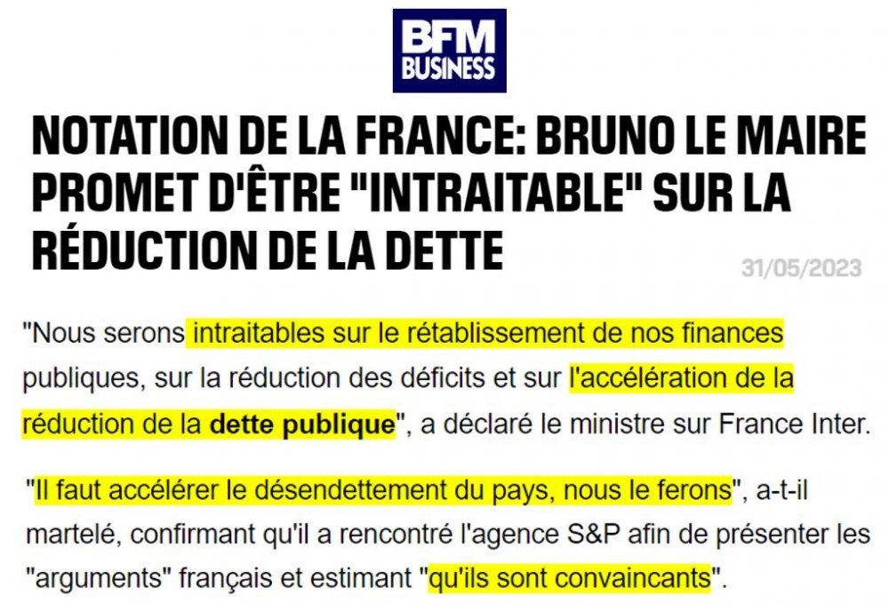 Bruno Le Maire est même allé à la radio rabâcher son souhait « d’accélérer le désendettement de la France » (inutile d’accélérer, il suffit simplement de commencer), et raconter sa rencontre avec S&P.