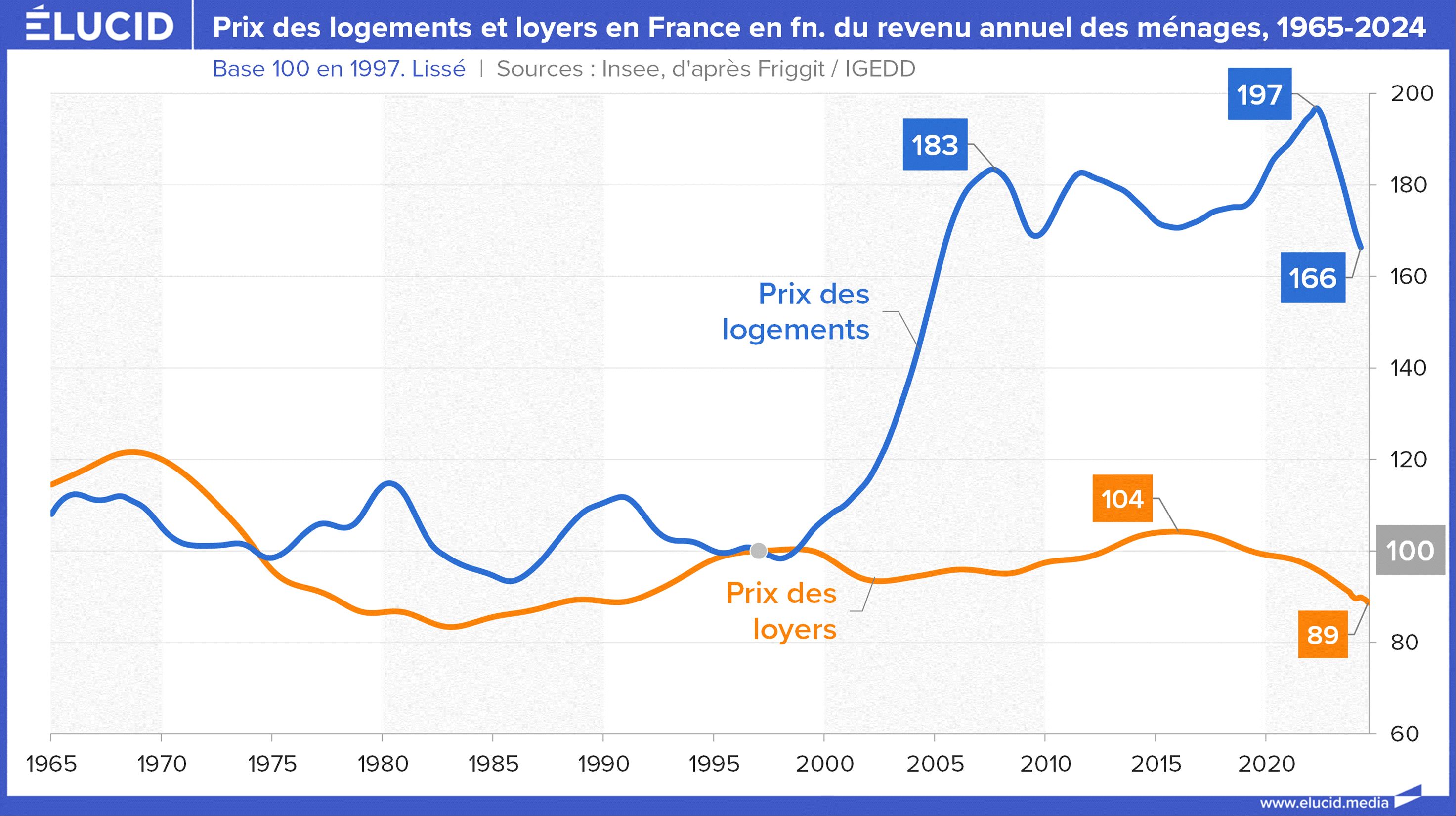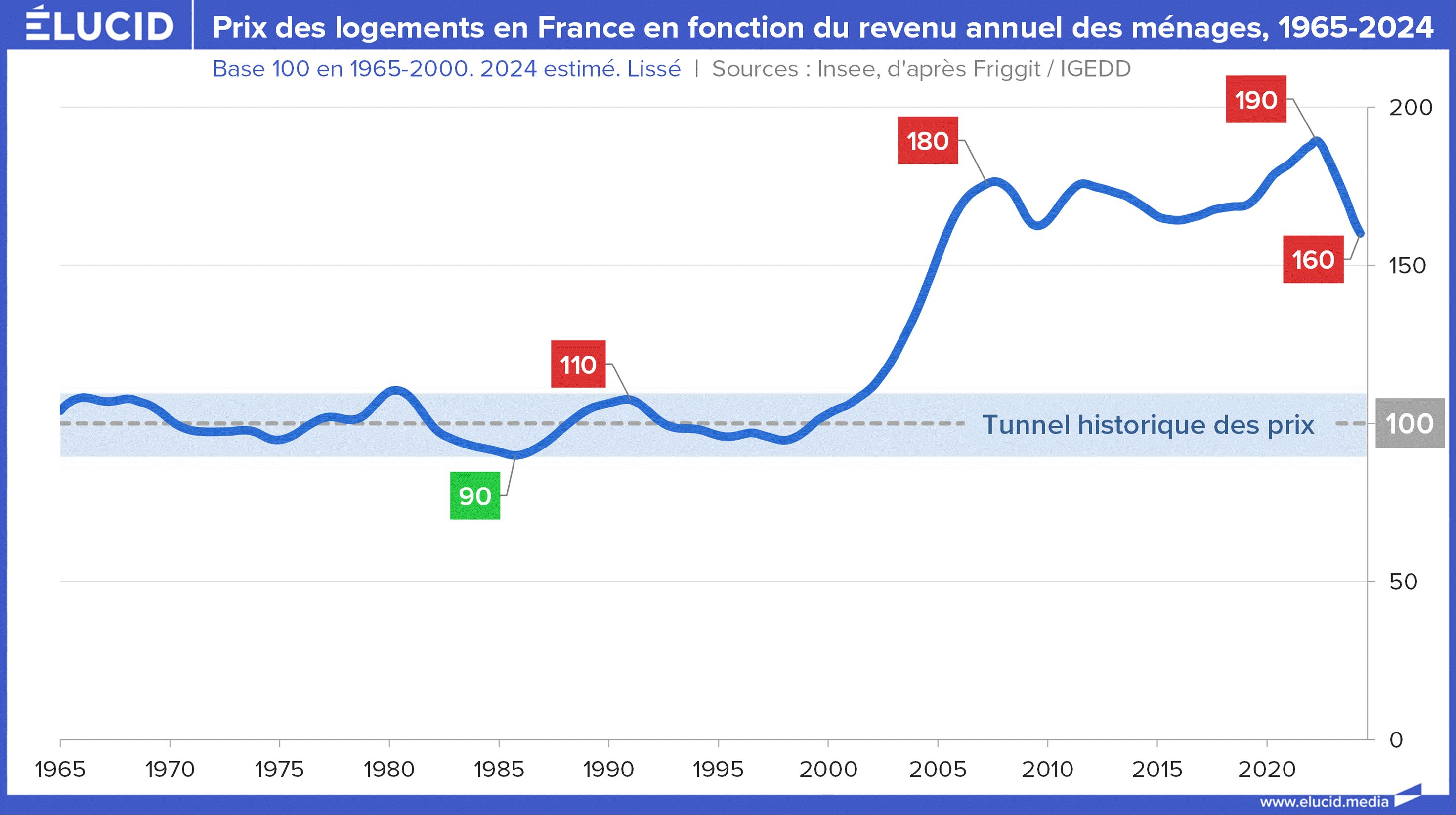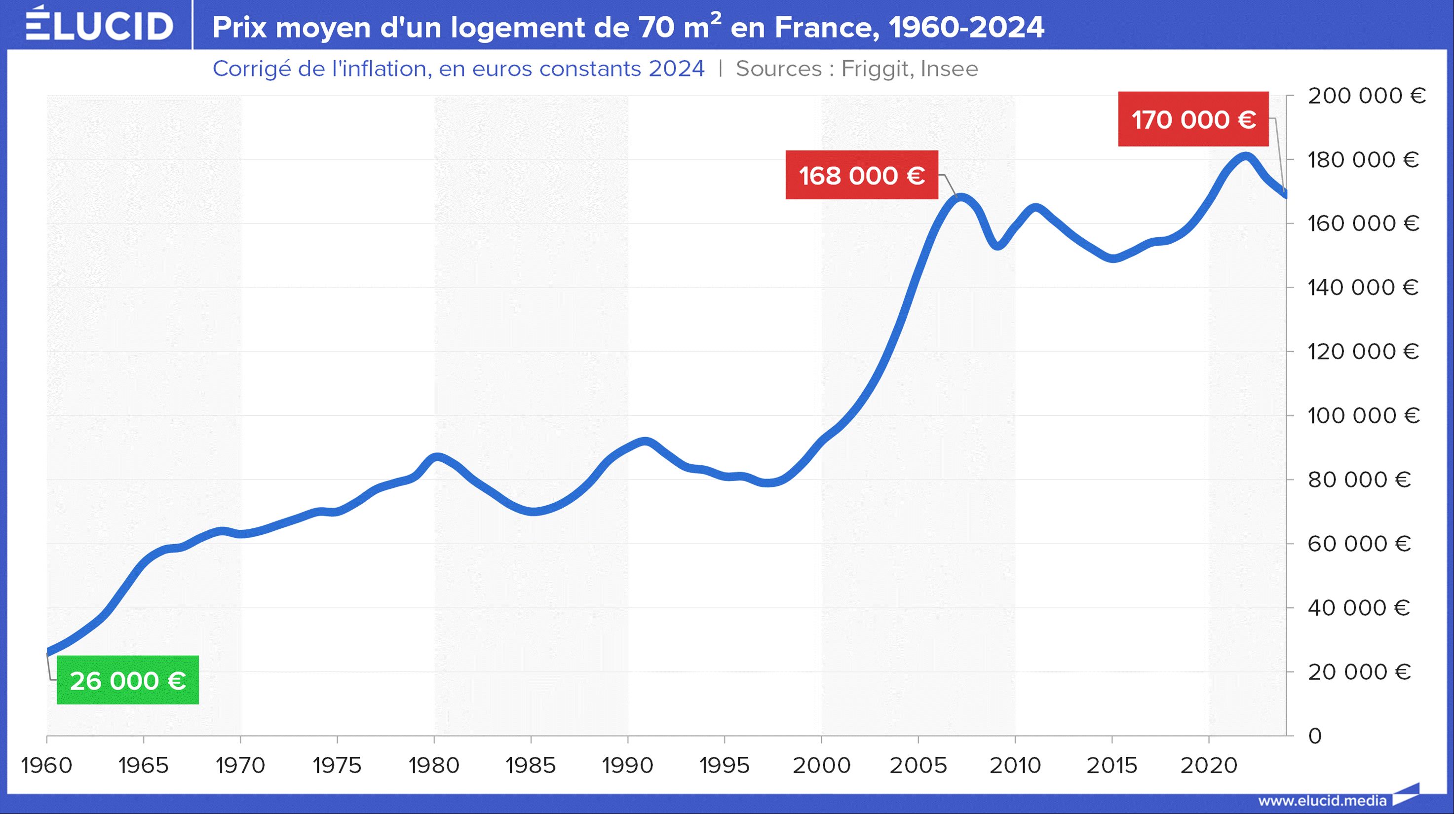 Si on analyse cette évolution des prix (corrigée de l’inflation) en euros, on comprend pourquoi des ouvriers pouvaient acheter facilement leur maison dans les années 1970 ou 1980, alors qu'aujourd'hui, à 170 000 € en moyenne, la tâche est devenue très difficile.