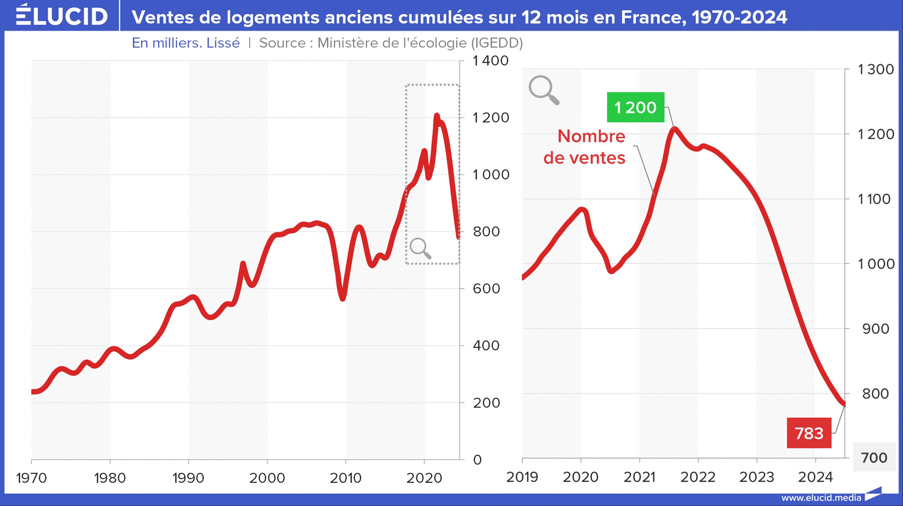 Le nombre annuel de ventes immobilières de logements anciens (dans le sens « pas neufs ») n’a pratiquement pas cessé d’augmenter entre 1970 et la crise de 2008. Après un « trou d’air » de quelques années, elles sont reparties en très forte hausse entre 2015 et 2021. Cependant, depuis mi 2021, les ventes ont fortement reculé, avec une baisse de -35 % qui semble à peine ralentir.