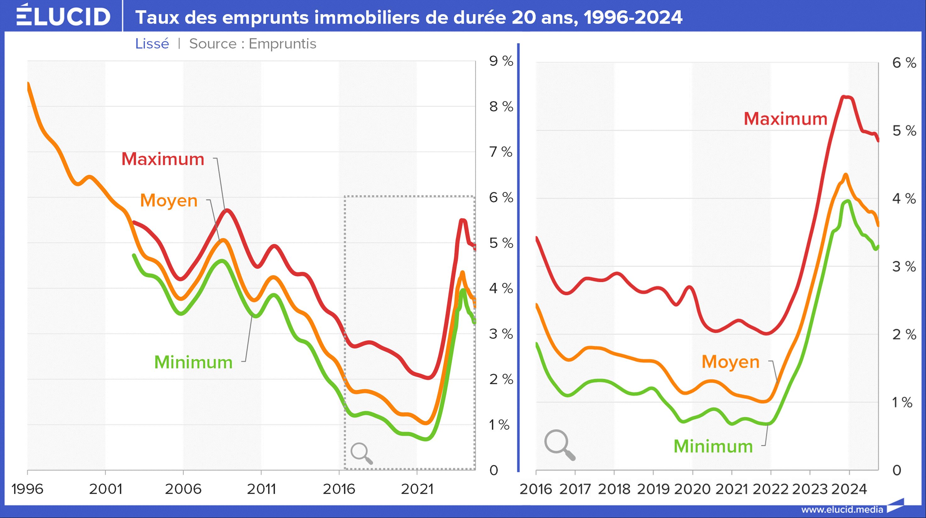 En effet, avec le retour de l’inflation à des niveaux plus habituels, la BCE a commencé à baisser ses taux, très faiblement. Les taux n’étant en réalité pas si élevés, il ne faut pas s’attendre à une énorme baisse dans les mois à venir. Cependant, les prochaines baisses devraient marquer la fin de la baisse des prix immobiliers au bout de quelques trimestres.