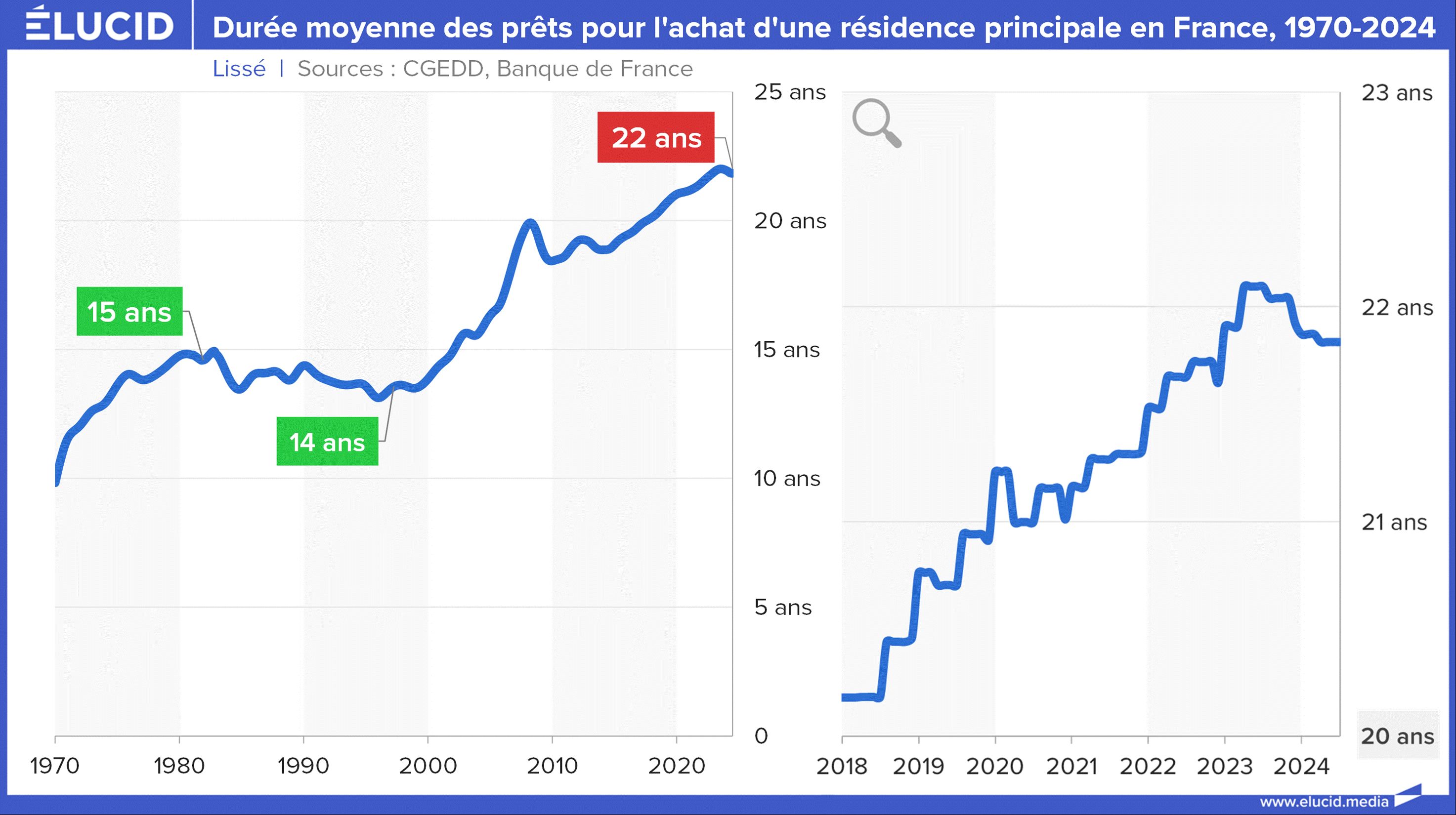 2/ la durée du crédit, compris entre 7 ans et 25 ans (limite légale). La hausse des prix depuis 2015 a poussé les emprunteurs à maximiser la durée de crédits : plus de la moitié atteignent 25 ans, et 80 % 20 ans et plus. Cet élément est donc lui aussi peu variable en pratique ;