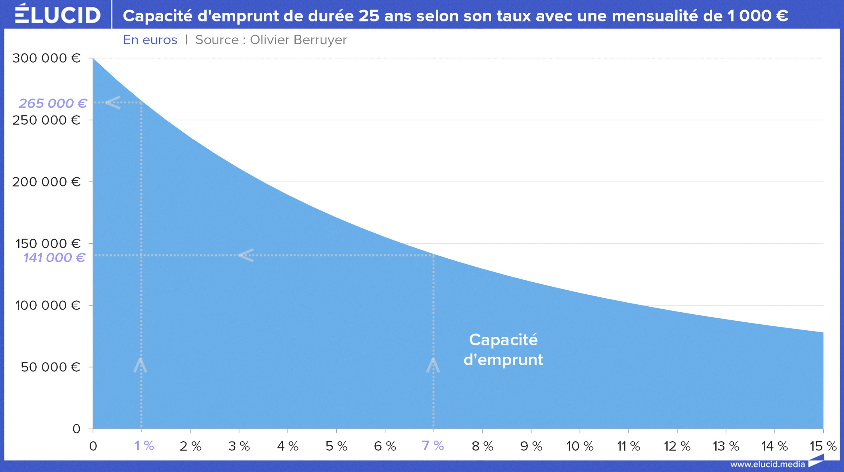 En pratique, le montant qu’un ménage peut emprunter dépend quasi exclusivement du taux d’intérêt. De plus, ce taux a une très forte influence sur le capital. Prenons l'exemple d'un ménage remboursant 1 000 € par mois pendant 25 ans. Quand les taux d'intérêt étaient à 7 % (c'était encore le cas en 2007 pour certains profils !), la capacité d'emprunt dans de telles conditions était de 141 000 €. Mais quand les taux ont fondu à 1 % (début 2022), la capacité d'emprunt dans les mêmes conditions était de 265 000 €.