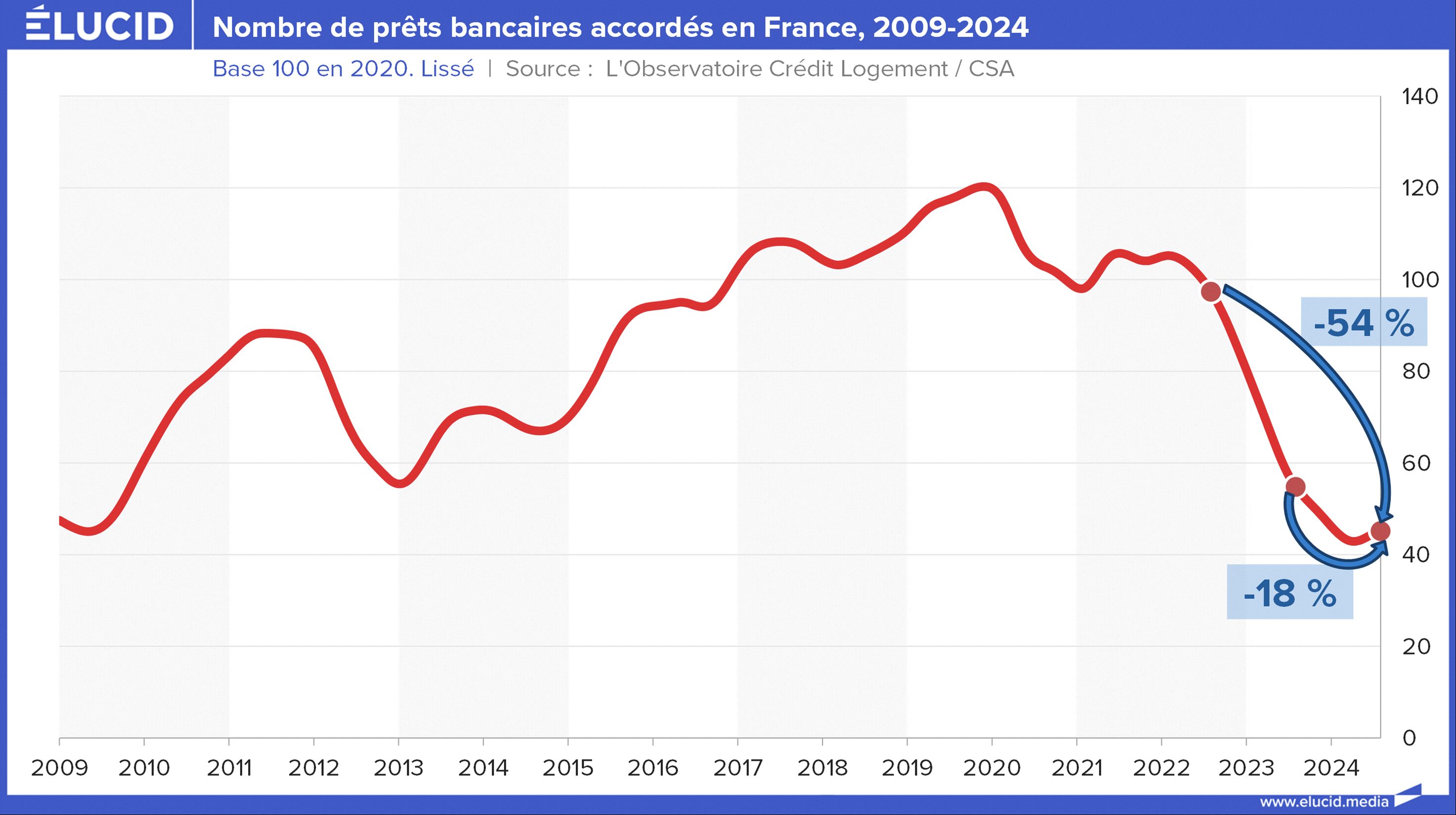 L’évolution de la crise immobilière est assez difficile à analyser à cause des longs délais de reporting. La Banque de France communique sur les crédits produits avec 5 mois de retard, alors qu’ils découlent d’accords de crédits réalisés deux à trois mois plus tôt. Par chance, l’assureur Crédit Logement dispose d’une analyse avancée, qui porte sur les accords de crédits. Et les chiffres sont dramatiques : en un an, les banques ont accordé, en nombre, 18 % de crédits en moins, et ce par rapport à une période qui était déjà en baisse. La baisse totale sur 2 ans est de -54 %.