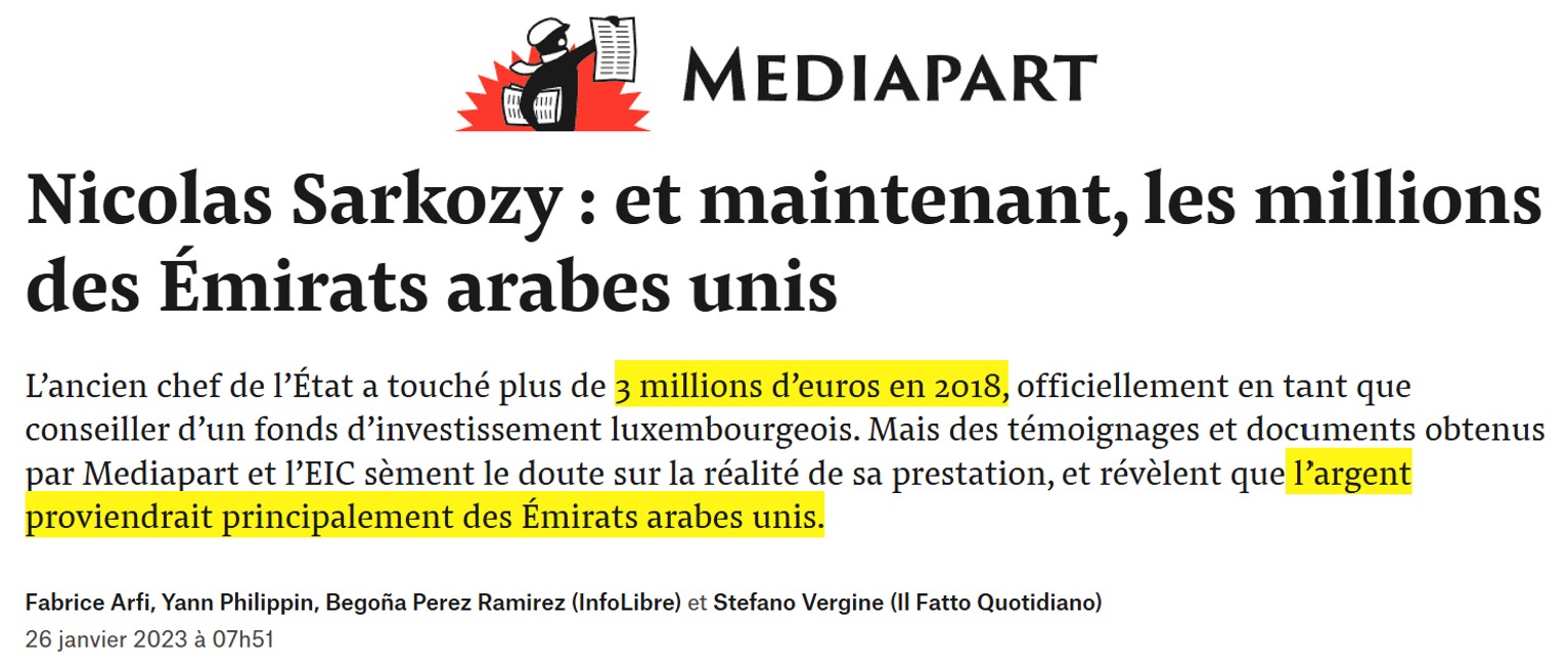 Nicolas Sarkozy lui-même fait l'objet de soupçons, même si les procédures judiciaires ne sont pas toutes abouties. Des conférences aux Émirats facturées au moins 100 000 euros pièce (Qui ne voudrait pas les conseils d’un tel professionnel ?). Environ 3 millions d'euros reçus en 2018, officiellement d’un fonds luxembourgeois (on aime toujours beaucoup les fonds luxembourgeois dans ce milieu européiste), qui sont soupçonnés de provenir en réalité du family office du président des Émirats, selon Mediapart.