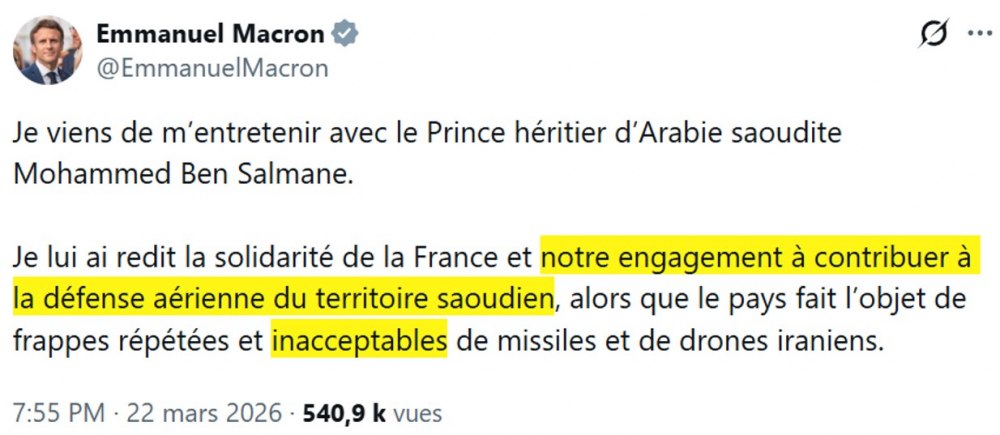 Et si Macron s’est conformé, en apparence, à ses obligations contractuelles, il a aussi fait le choix d’aller bien au-delà. Téléphoner au prince héritier d'Arabie saoudite Mohammed Ben Salmane pour lui réaffirmer « la solidarité de la France et notre engagement à contribuer à la défense aérienne du territoire saoudien », alors qu’aucun accord de défense ne nous lie à ce pays, et que l’Arabie saoudite venait juste d’autoriser les États-Unis à utiliser la base King Fahd pour frapper l’Iran, n’était pas une obligation. C’était un choix politique. Comme l’avait été, en sens inverse, le choix de l'Espagne de refuser toute utilisation de ses bases à l’armée américaine.