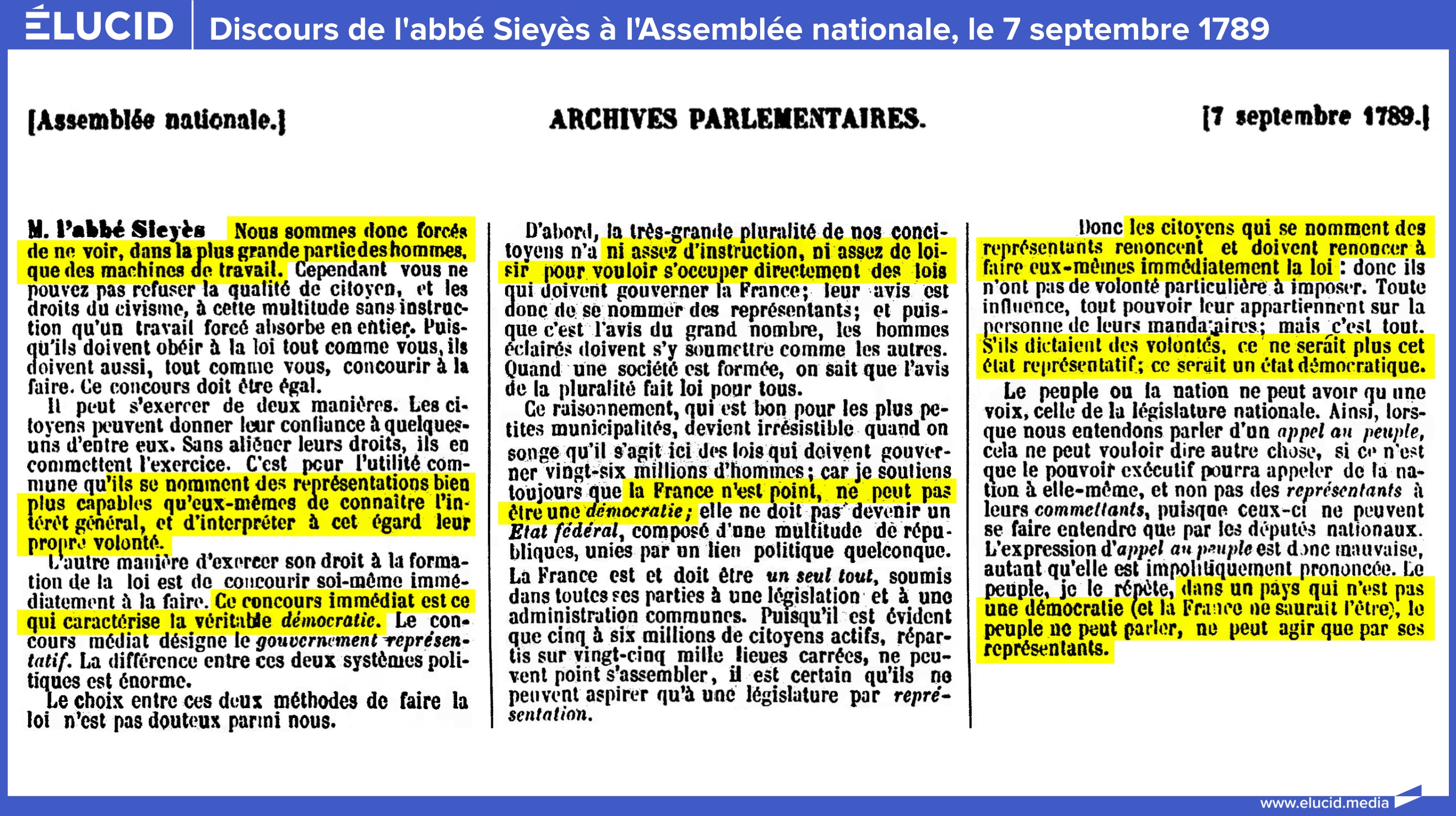 Je soutiens toujours que la France n'est point, ne peut pas être une démocratie […] Puisqu'il est évident que 5 à 6 millions de citoyens actifs, répartis sur vingt-cinq mille lieues carrées, ne peuvent point s'assembler, il est certain qu'ils ne peuvent aspirer qu'à une législature par représentation. Donc les citoyens qui se nomment des représentants renoncent et doivent renoncer à faire eux-mêmes immédiatement la loi : donc ils n'ont pas de volonté particulière à imposer. […]