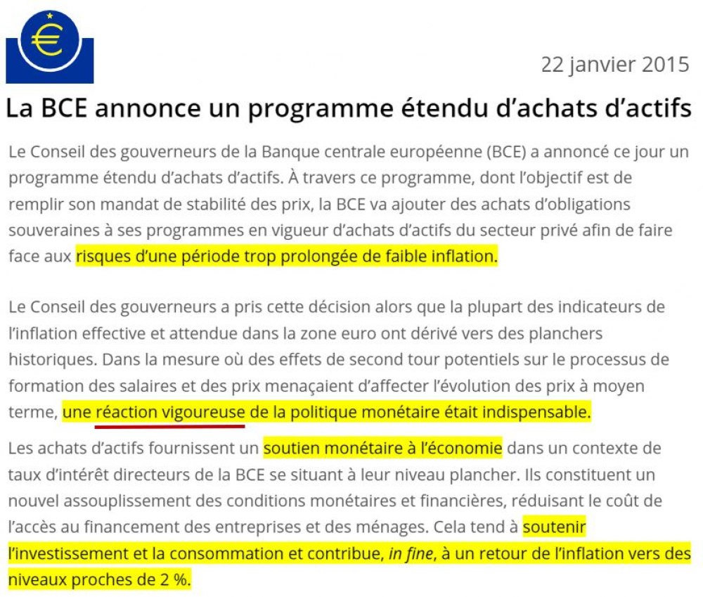 Rappelons également, comme on l’a vu, que le but officiel de la création monétaire dantesque de la BCE était explicitement de lutter contre les « risques d’une période trop prolongée de faible inflation » par une « réaction vigoureuse » [sic.] :
