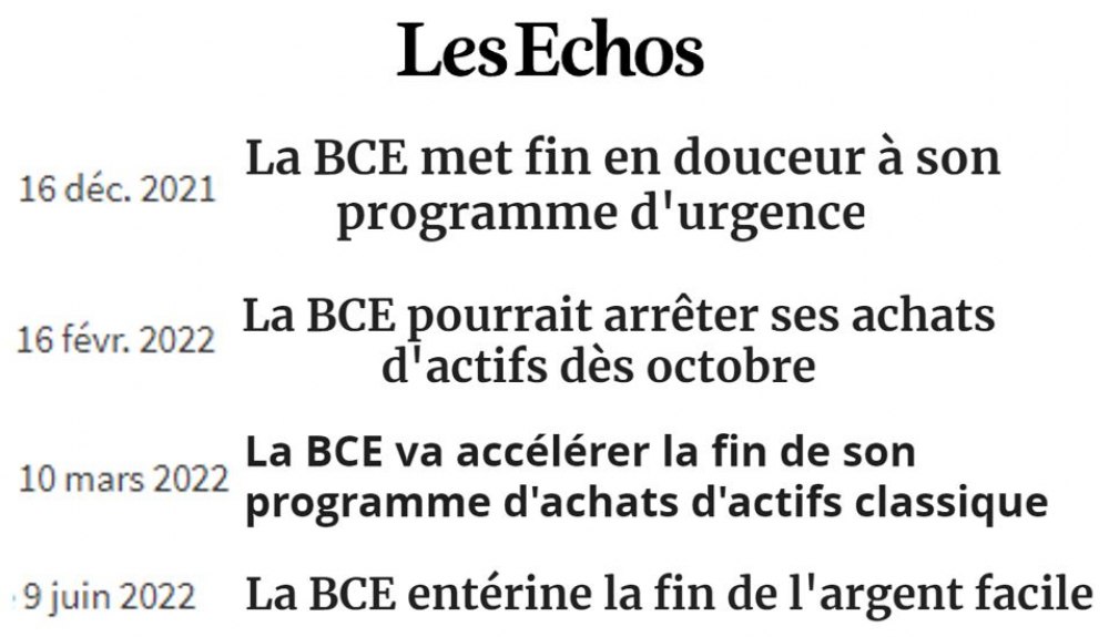 La réaction ayant été à l’évidence bien trop « vigoureuse », la situation très inflationniste a obligé les banques centrales à appuyer sur le frein à main, et à cesser d’urgence toute nouvelle création monétaire.