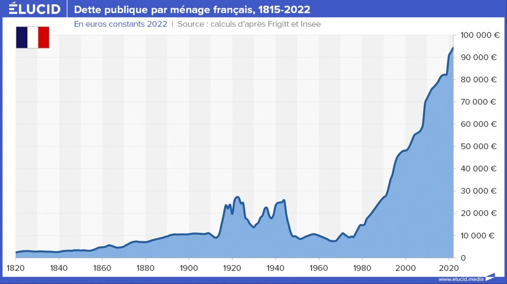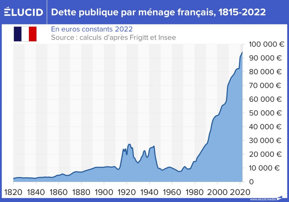 Ce qui est très exceptionnel, en revanche, c'est le montant atteint par ses montagnes de dettes. La seule dette publique représente désormais près de 100 000 € par ménage français :