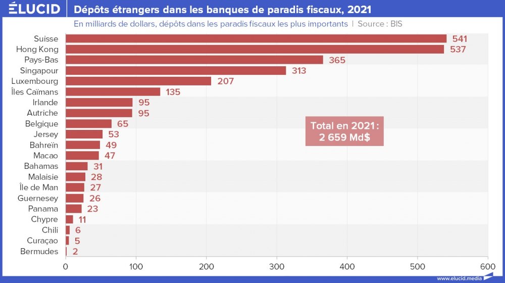 La Suisse est le paradis fiscal dont les banques enregistrent le montant le plus élevé de dépôts étrangers en 2021, 541 milliards de dollars, soit 20 % des dépôts étrangers totaux dans les paradis fiscaux les plus importants. Le pays a pourtant été retiré de la liste des paradis fiscaux par l’Union européenne en octobre 2019. Hong Kong enregistre sensiblement le même montant de dépôts étrangers dans ses banques : 537 milliards de dollars.