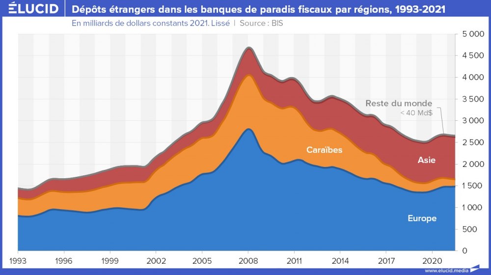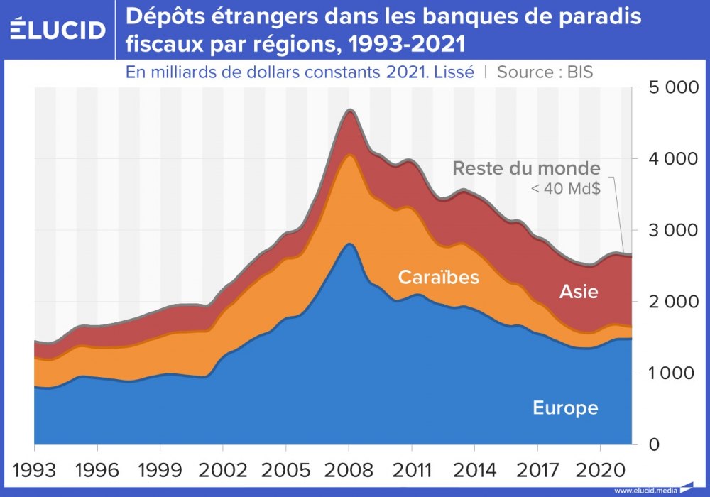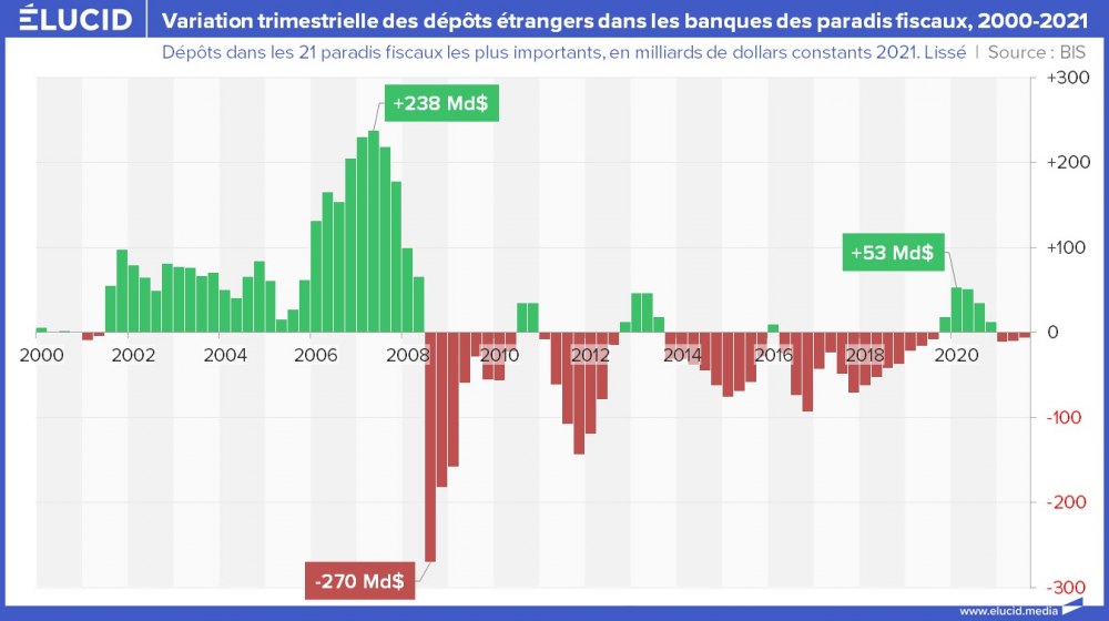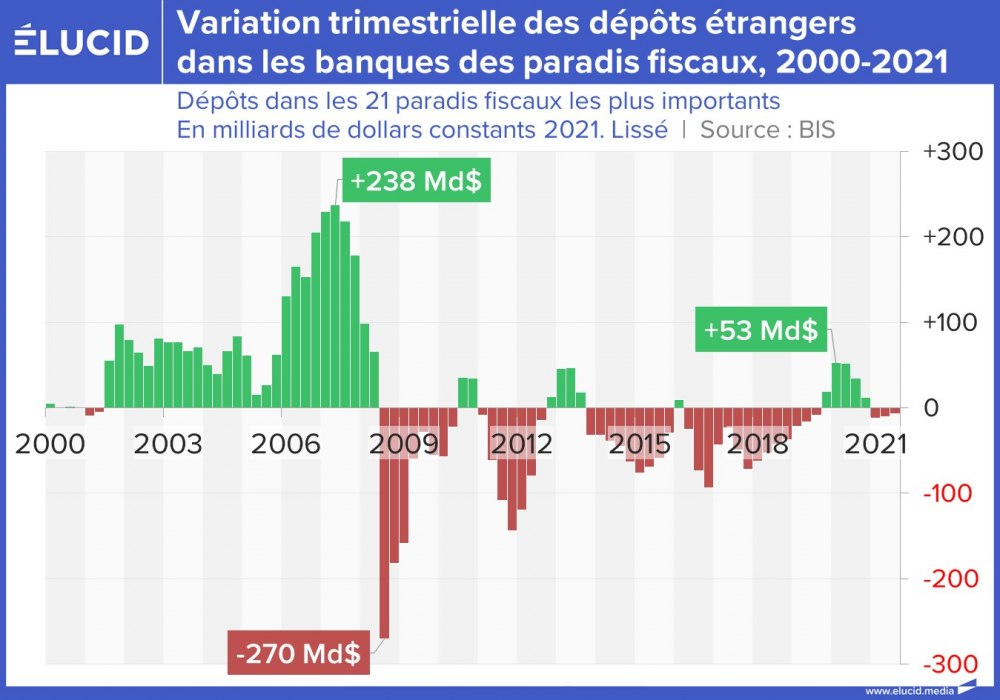 - Depuis 2008, le montant des dépôts étrangers dans les paradis fiscaux a chuté de 2100 milliards de dollars, pour atteindre 2660 milliards de dollars au troisième trimestre 2021, soit le montant enregistré fin 2003.