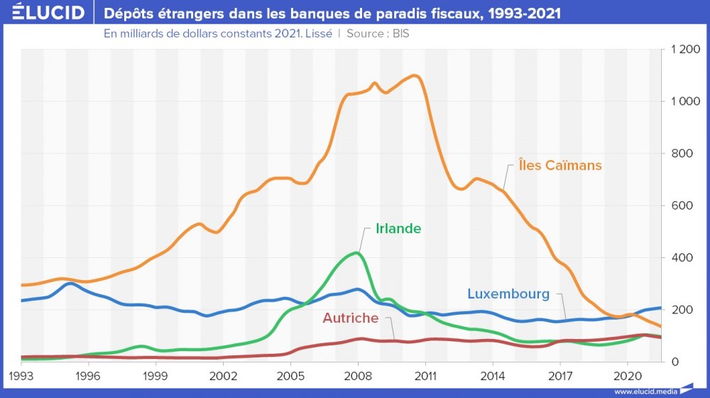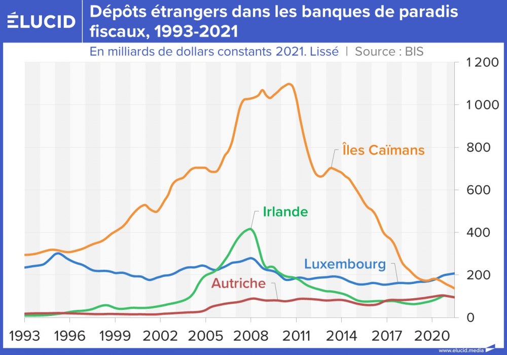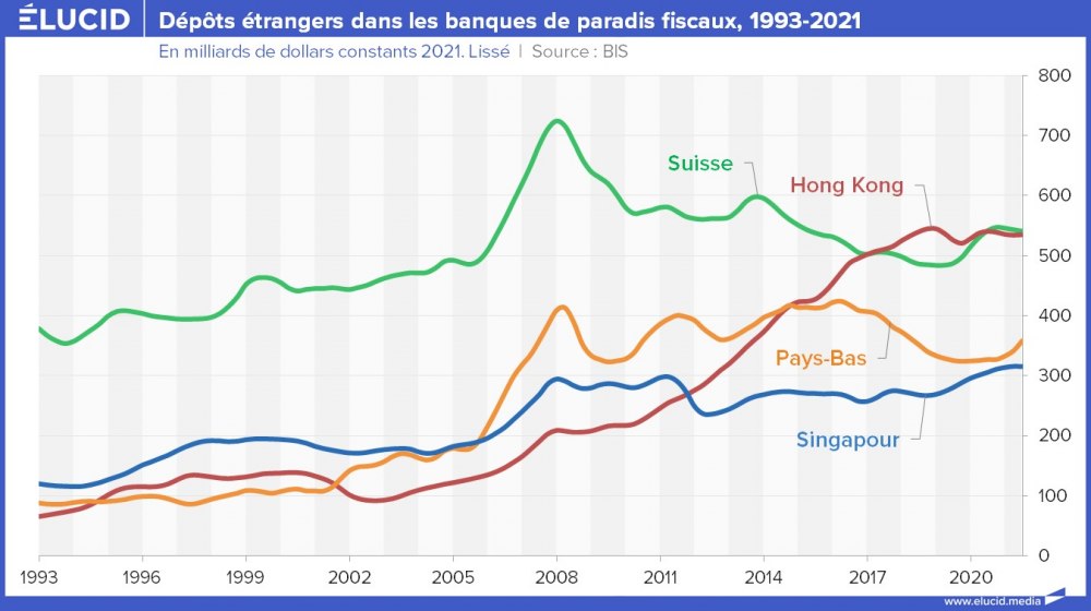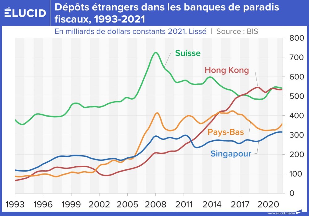 - En Suisse, le montant des dépôts étrangers passe de 380 milliards à 725 milliards de dollars entre 1993 et 2008. Le pays représente alors 15 % du montant total des dépôts dans les paradis fiscaux. Il baisse ensuite pour atteindre 480 milliards de dollars en 2019, puis remonte jusqu’à 540 milliards au troisième trimestre 2021.