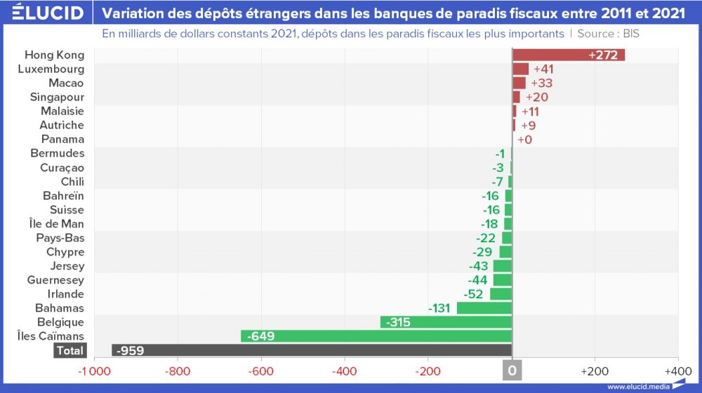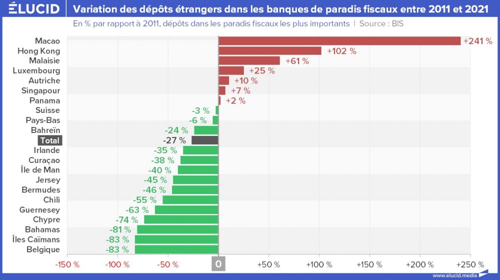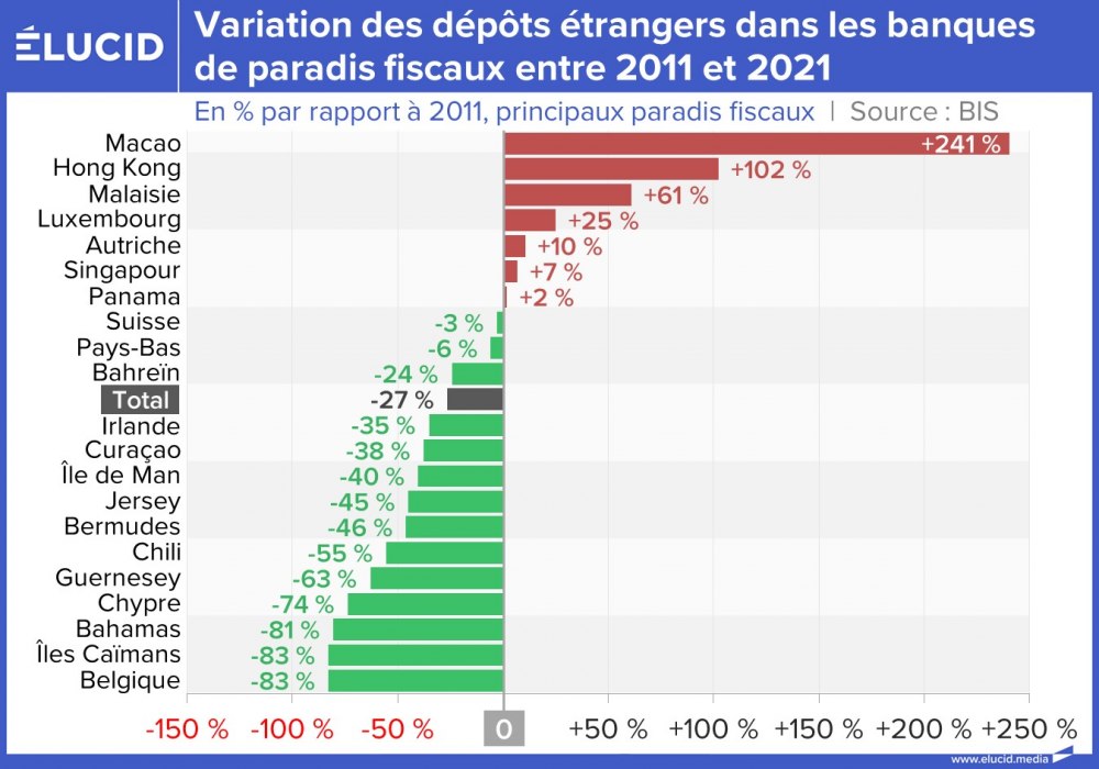 Le graphique ci-dessous permet de synthétiser la progression du montant des dépôts étrangers dans les 21 principaux paradis fiscaux du monde sur la dernière décennie. On distingue que deux tiers de ces pays ont vu le montant de ces dépôts baisser. Au total, la baisse a été de 27 %. Macao est le paradis fiscal ayant connu la plus forte progression du montant des dépôts étrangers : +241 % depuis 2011.