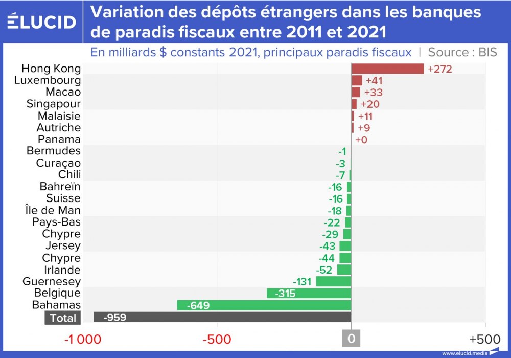 - À Hong Kong, le montant des dépôts étrangers passe de 65 milliards à 209 milliards de dollars entre 1993 et 2008. Le pays représente alors 4 % du montant total des dépôts dans les paradis fiscaux. Contrairement aux autres principaux paradis fiscaux, ce montant réaugmente fortement à partir de 2010, pour s’établir à 537 milliards de dollars en 2021. Hong Kong est donc le paradis fiscal ayant enregistré la plus forte hausse des dépôts étrangers depuis 2008.