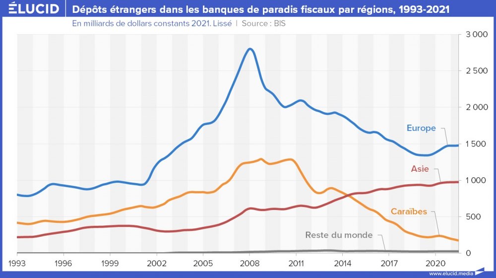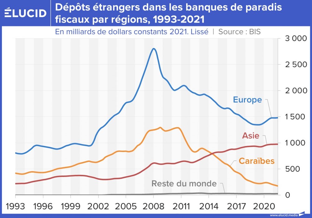 - Depuis, le montant des dépôts dans les paradis fiscaux d’Europe et des Caraïbes a chuté, et s’établit respectivement à 1500 milliards et 173 milliards de dollars en 2021. Au contraire, les paradis fiscaux d’Asie ont connu un accroissement du montant des dépôts étrangers dans leurs banques, qui s’établit à 1000 milliards en 2021.