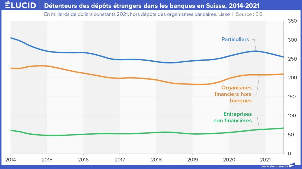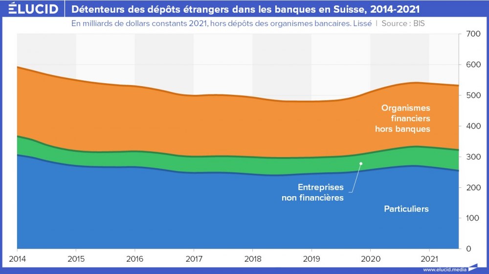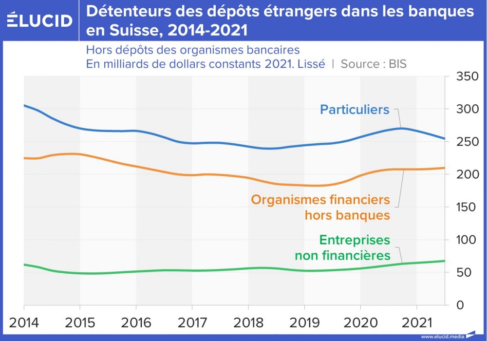 Le montant des dépôts des organismes financiers — hors banques — est resté stable autour de 200 milliards depuis 2014 et représente 37 % du total des dépôts en 2021. Enfin, le montant des dépôts des entreprises non financières est également resté stable, et s’établit à 70 milliards en 2021, soit 13 % du total.