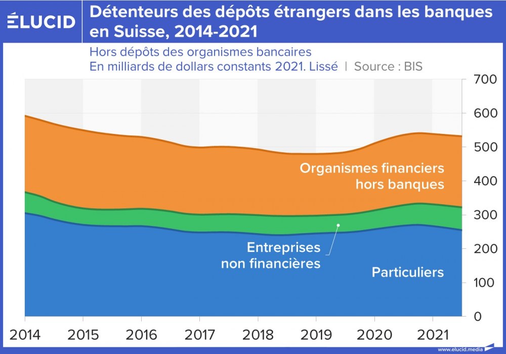Les deux plus importants paradis fiscaux d’Europe — la Suisse et les Pays-Bas — affichent des structures des dépôts étrangers dans leurs banques bien différentes. Ainsi en 2021, 47 % des dépôts étrangers dans les banques suisses sont issus de particuliers, pour un montant de 255 milliards de dollars. Ce niveau a légèrement baissé depuis 2014, puisqu’il se situait alors à 300 milliards de dollars.