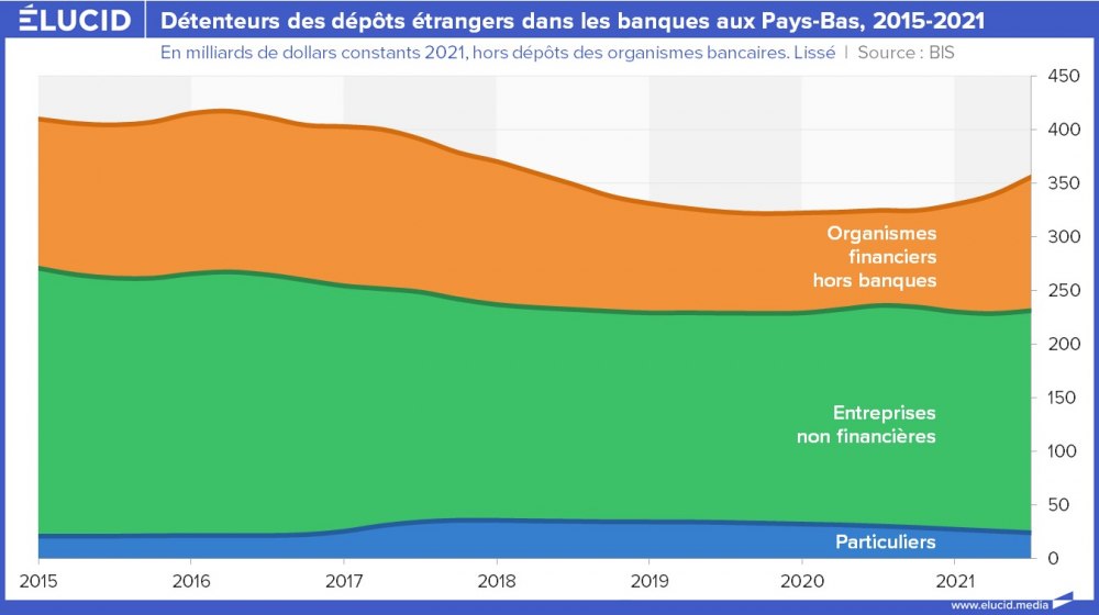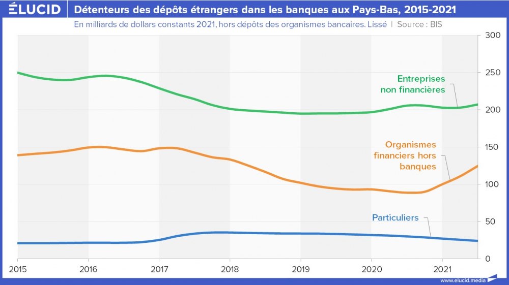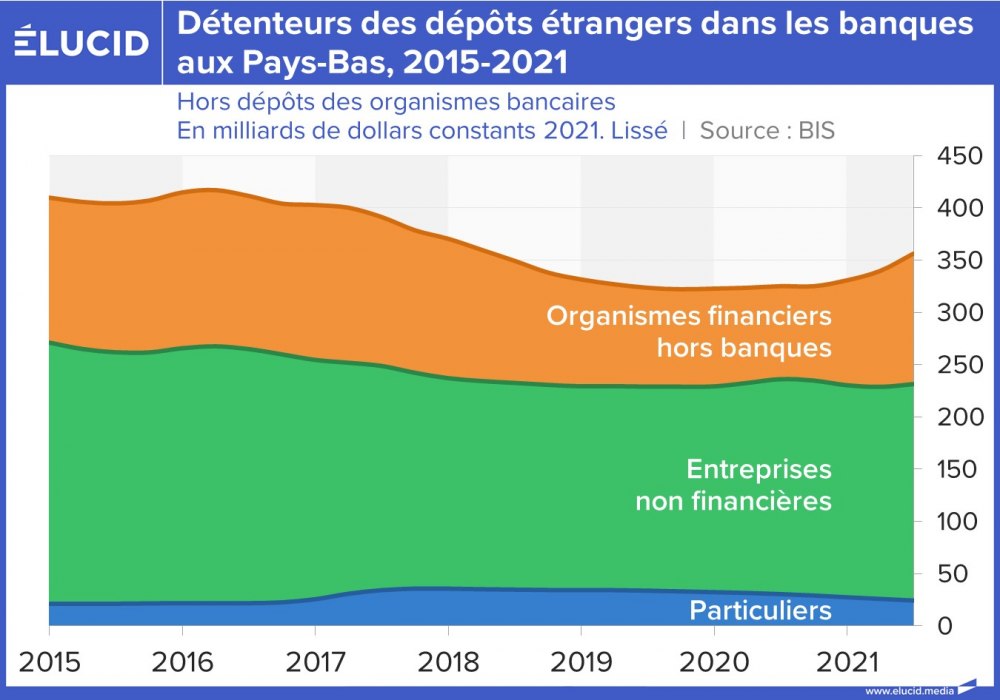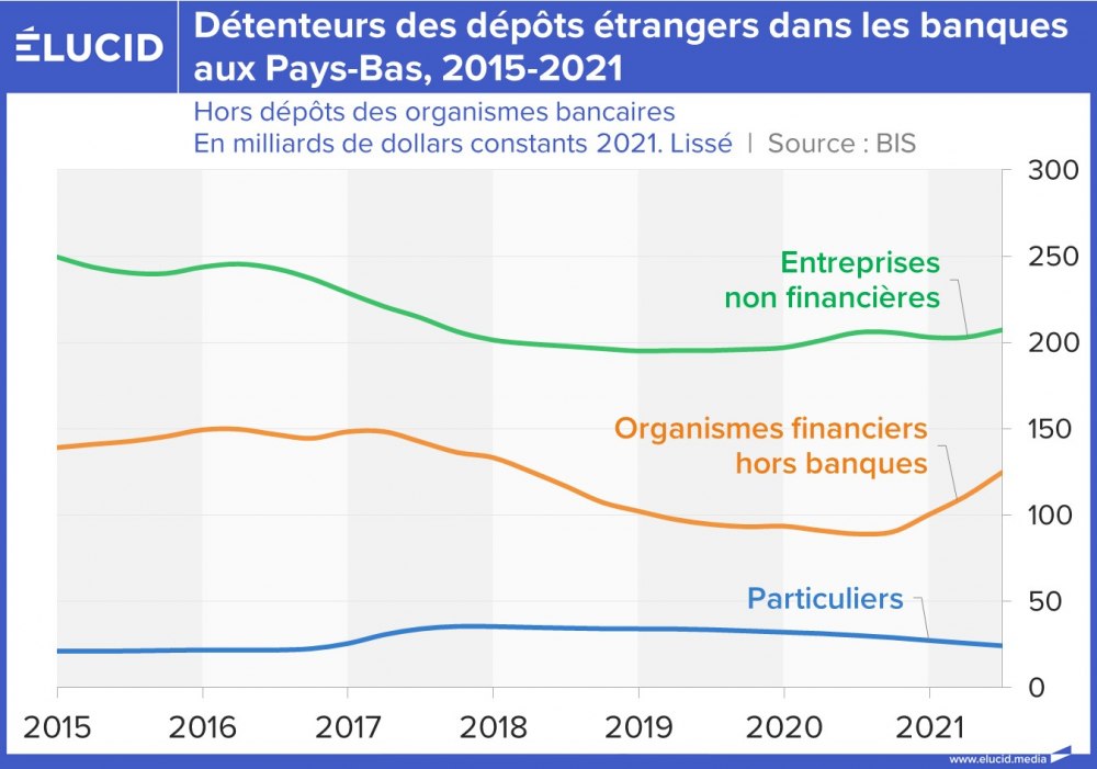 Aux Pays-Bas en 2021, 57 % des dépôts étrangers dans les banques néerlandaises sont issus d’entreprises non financières, pour un montant de 207 milliards de dollars. Depuis 2014, ce montant a baissé, puisqu’il se situait alors à 266 milliards de dollars. Dans le même temps, le montant des dépôts des organismes financiers — hors banques — est de 125 milliards de dollars en 2021, soit 35 % du montant total.