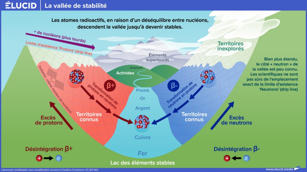Comme l'adret et l'ubac d'une vallée de montagne, la vallée de stabilité sépare des zones d’excès de nucléons différents, qui ont logiquement des modes de désintégration radioactive différents.