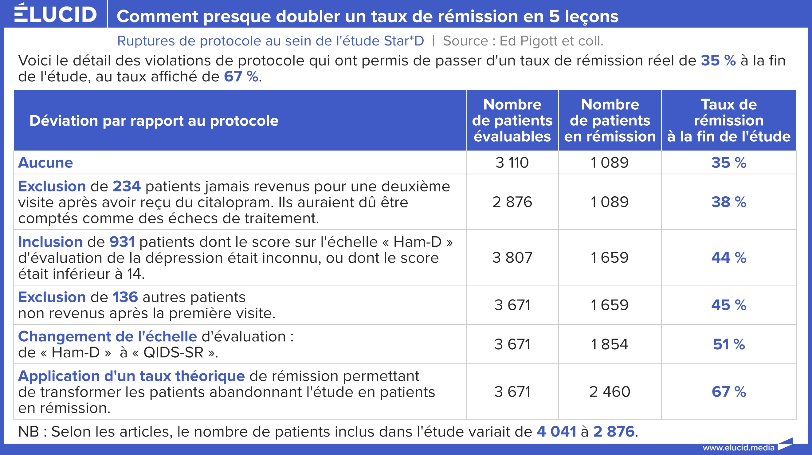 Enfin, les responsables de l’essai ont décidé de changer d’échelle d’évaluation en cours de route, passant de celle de Hamilton à une autre, QIDS-SR (5). Un « thermomètre » moins sensible pour tenter de dissimuler la fièvre ? « Ce changement de référentiel a notamment permis d’augmenter de 44,9 % le taux de rémission sous citalopram », relève Ed Pigott.