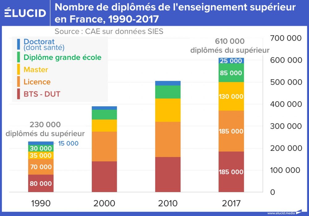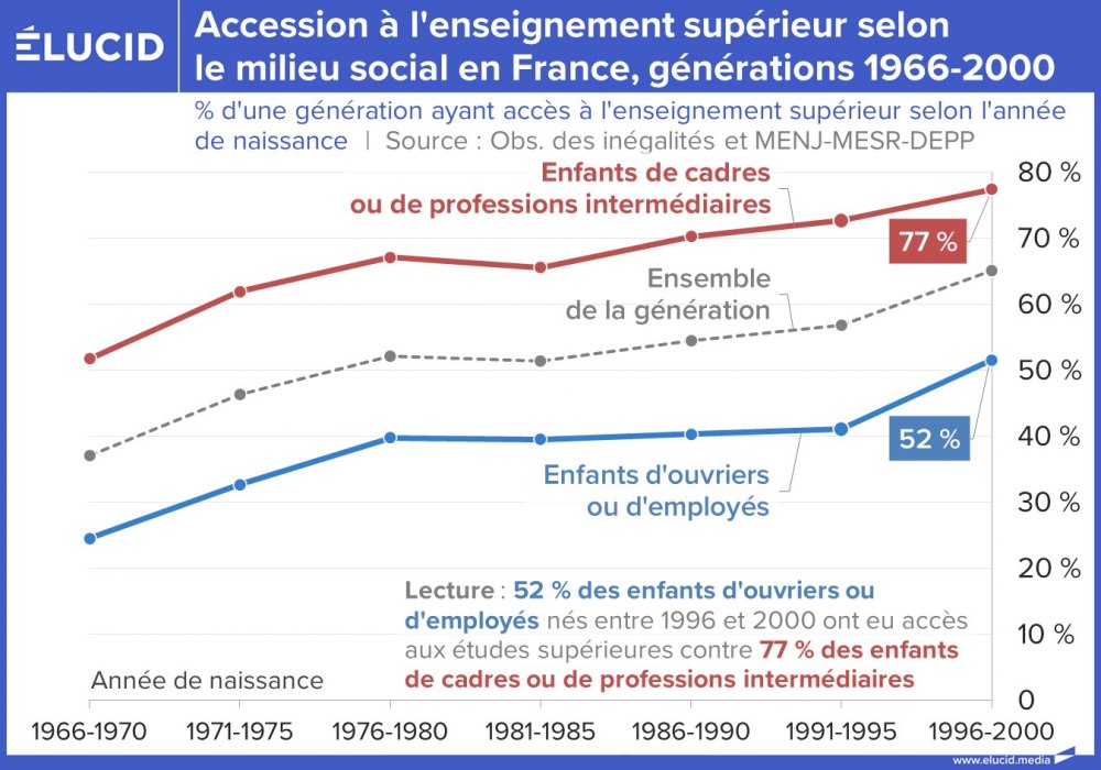 Depuis les années 1960, le nombre d’étudiants a été multiplié par huit en France. Avec cette massification de l’enseignement supérieur, de plus en plus d'individus ont eu accès à de meilleurs revenus et ont connu une amélioration de leurs conditions de vie et de santé. Cependant, cette « démocratisation des études » perpétue en réalité de nombreuses inégalités au sein du système éducatif.