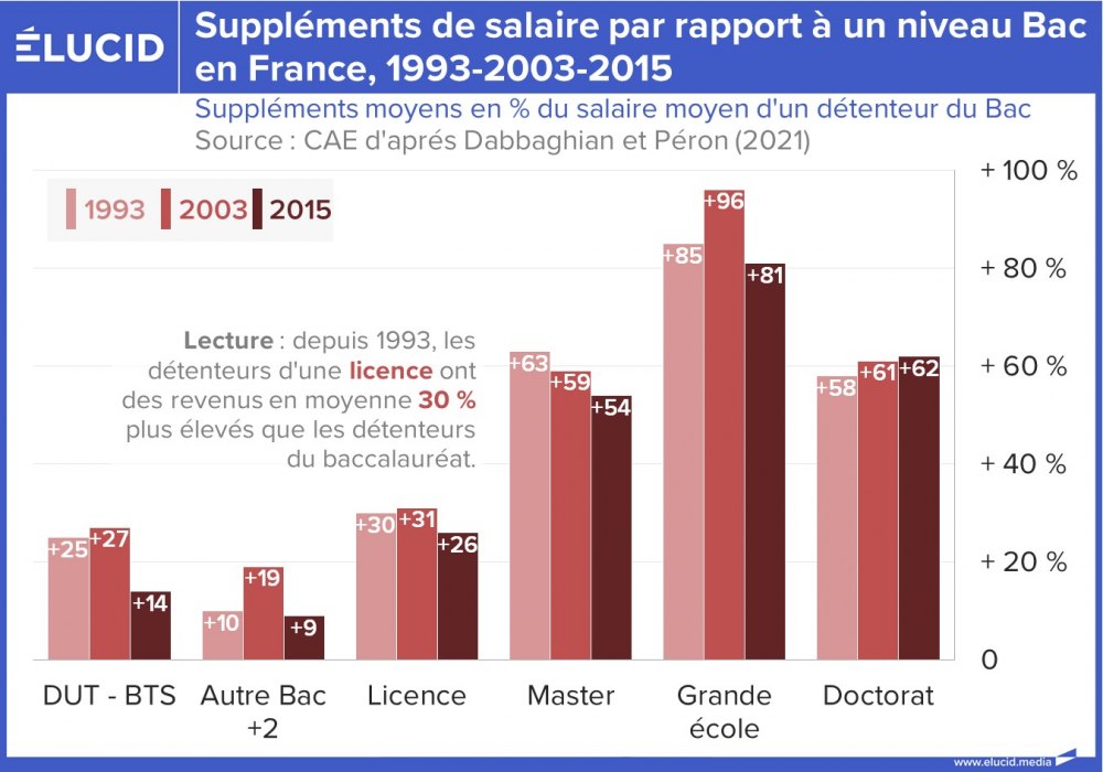 La poursuite d’études supérieures s'accompagne généralement de bénéfices salariaux. Depuis 30 ans, les observations montrent que les titulaires d’une licence ou d’un master gagnent en moyenne respectivement entre un tiers et moitié plus que les bacheliers.