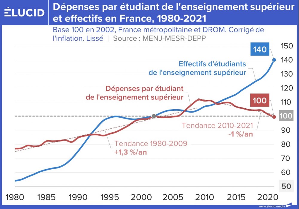 De plus, alors que jusqu’en 2009, la dépense par étudiant restait croissante, elle diminue depuis, au point de retrouver son niveau du début des années 2000. Un retour en arrière qui laisse apparaître le désinvestissement de l’État. Son corollaire est une dégradation du contexte d’apprentissage, qui se cumule à des conditions de vie difficiles pour les plus défavorisés.