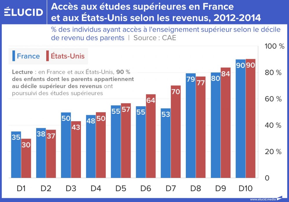 Contrairement aux idées reçues, la France ne fait guère mieux que les États-Unis en matière de réduction des inégalités d’accès aux études supérieures. Les faits sont définitivement têtus. Si l'on s'intéresse aux parents dont les revenus sont les plus faibles, seul un tiers de leurs enfants accèdent aux études supérieures. À l’autre bout du spectre, pour les foyers aux plus hauts revenus, ce sont 90 % des enfants qui accèdent au supérieur. Notre système éducatif basé sur « l’égalité des chances » n’apparaît donc pas franchement plus égalitaire que celui des États-Unis.