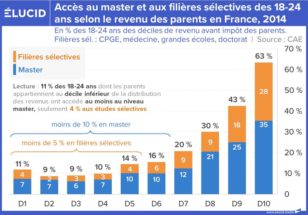 Quand les parents font partie de la moitié la plus basse de la distribution des revenus, moins de 5 % des jeunes de chaque tranche ont accès aux filières sélectives et à peine 10 % aux masters. Ils sont respectivement 35 % et 30 % pour les foyers placés dans le haut de la distribution des revenus.