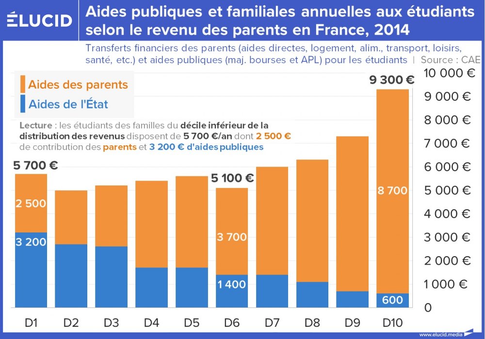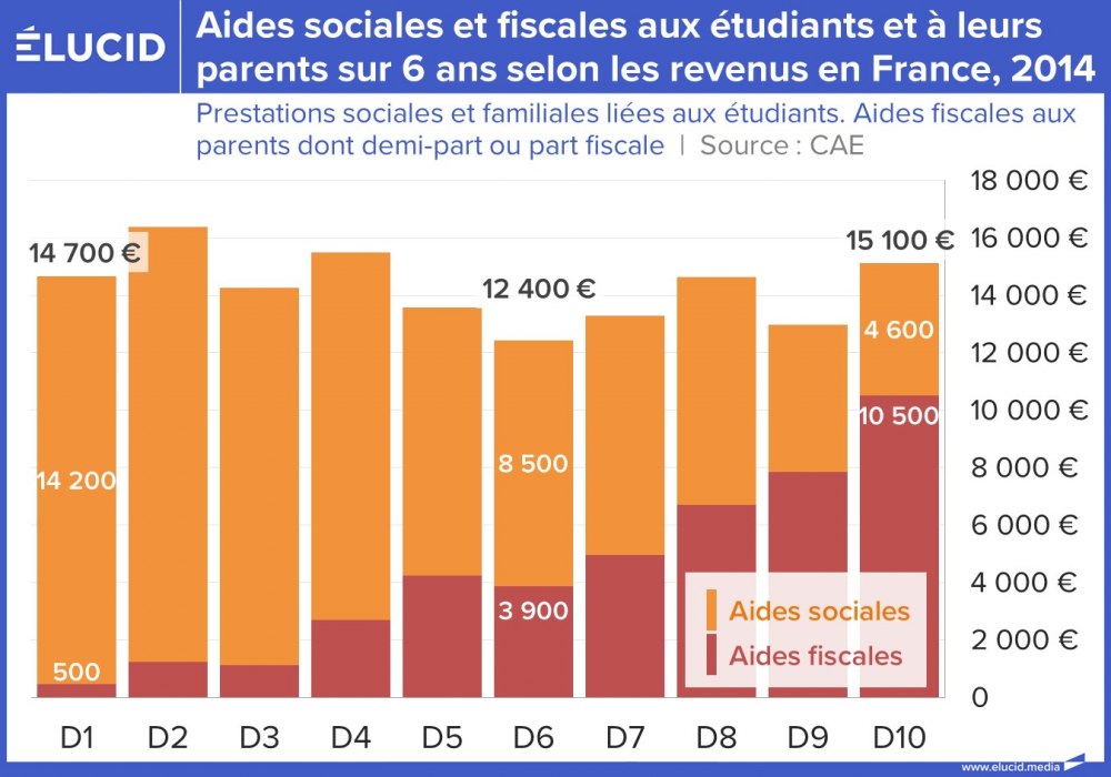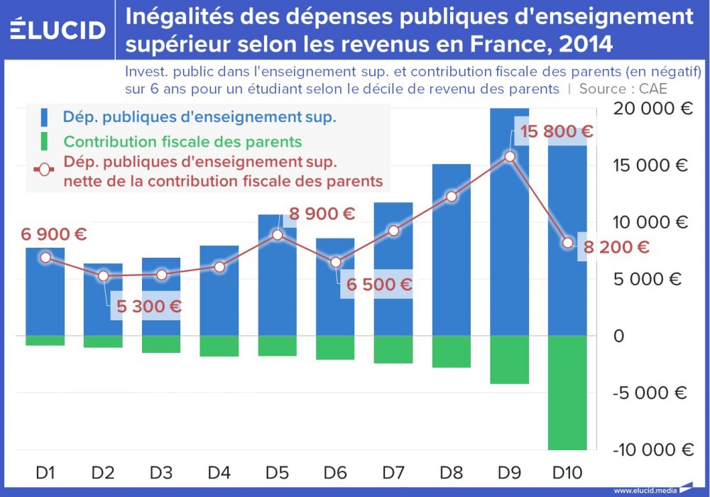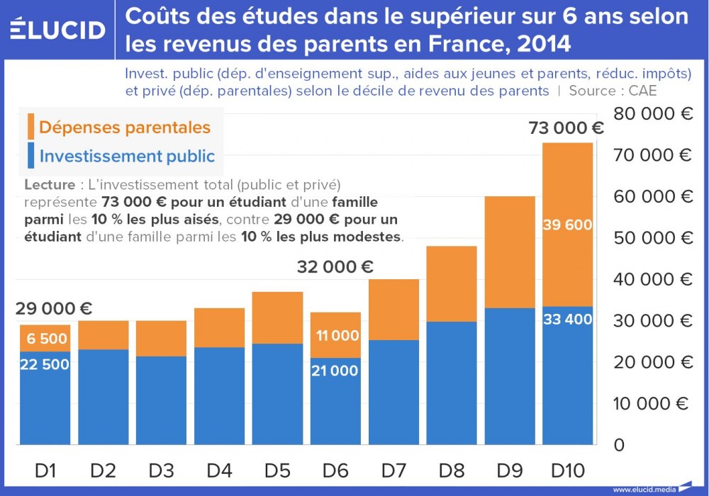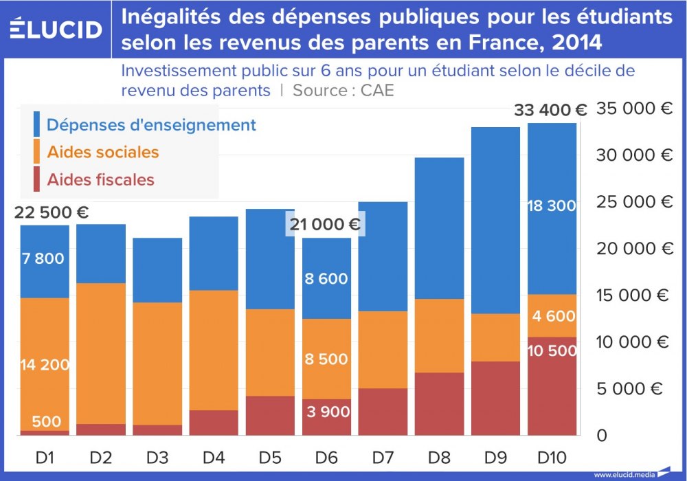 Si les prestations sociales et familiales sont bien ciblées sur les plus modestes, les déductions fiscales profitent bien davantage aux ménages aisés. Au total, les étudiants des milieux les plus favorisés reçoivent une fois et demi plus en contributions publiques que ceux des milieux les plus modestes. D'autre part, le montant que les parents les plus aisés consacrent aux études de leurs enfants est plus de deux fois supérieur à celui des parents les plus pauvres.