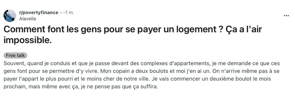 Si les personnes de la tranche à 74 000 $ (6e décile) peuvent s’en sortir, les choses sont infiniment plus compliquées pour les tranches inférieures. Songeons à ceux qui se trouvent dans la tranche à 9 000 $ ou 23 000 $, pour qui la situation doit être dramatique (étant précisé que ces revenus incluent toutes les formes, et notamment les aides sociales publiques…).
