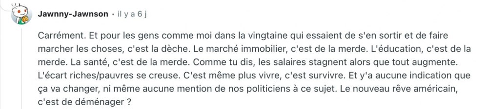 180 millions d’Américains n’arrivent pas à joindre les deux bouts, 47 millions dépendent des banques alimentaires, l’espérance de vie recule, 35 % des adultes reportent leurs rendez-vous médicaux pour des raisons budgétaires, la population active diminue, les emplois sont pour une large part sous-payés et/ou de faible qualité, et le bouleversant forum Reddit dédié aux personnes en difficultés financières « r/povertyfinance » est passé de 65 000 abonnés en 2018 à 2,4 millions aujourd’hui. Tous les indicateurs socio-économiques pointent vers une baisse du niveau de vie des Américains. Cette donnée bien trop souvent oubliée dans l’analyse économique des États-Unis doit conduire à nuancer largement les discours appelant à s’inspirer du soi-disant « modèle américain ».